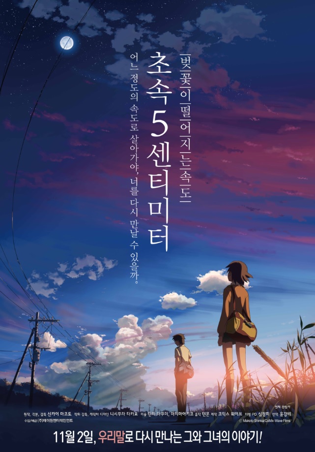 "초속 5센티미터"는 2007년에 개봉한 일본의 애니메이션 영화로, 시노 마키토 시카이(Shinkai Makoto)가 제작한 작품 중 하나입니다. 이 영화는 거리와 시간이 먼 두 사람 사이의 감정을 다룹니다. 제목 "초속 5센티미터"는 이들의 감정이 서로에게 더 가까워지고자 하지만 먼 거리 때문에 그리움을 느낀다는 메시지를 담고 있습니다.
